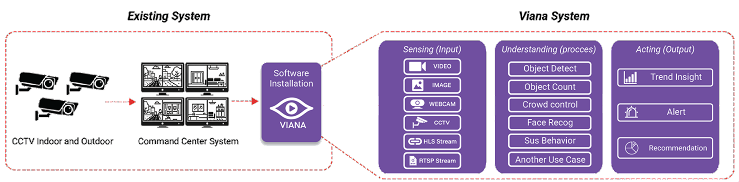 VIANA is an AI based smart solution that transforms ordinary cameras into real time insights to improve operational efficiency and area surveillance. With advanced visual analytics, VIANA enables movement detection, space capacity monitoring, traffic flow management, object detection, and suspicious activity identification making area management more efficient and effective.